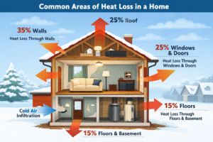Caption: Common areas of heat loss and energy leakage in a typical home.